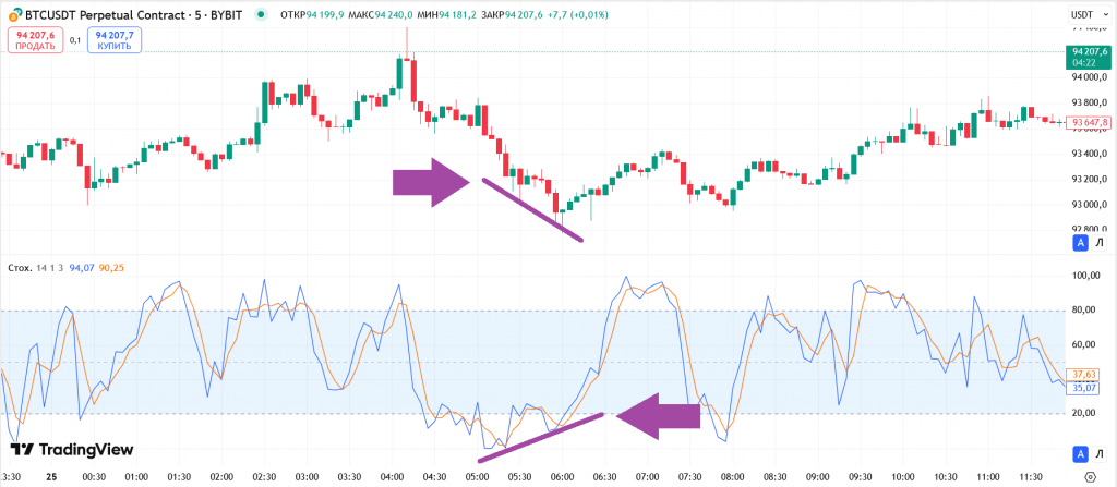 - Покупка: когда %K пересекает %D снизу вверх в области перепроданности (ниже 20)․